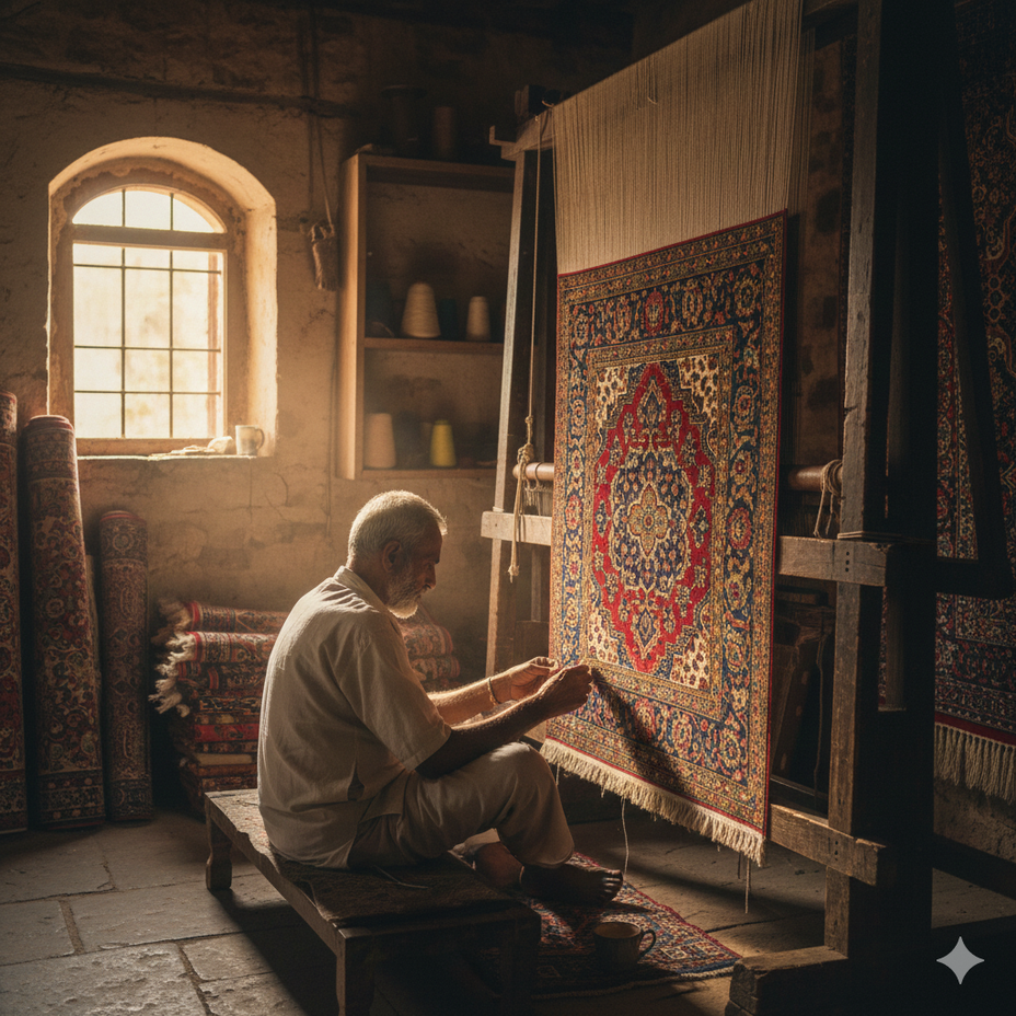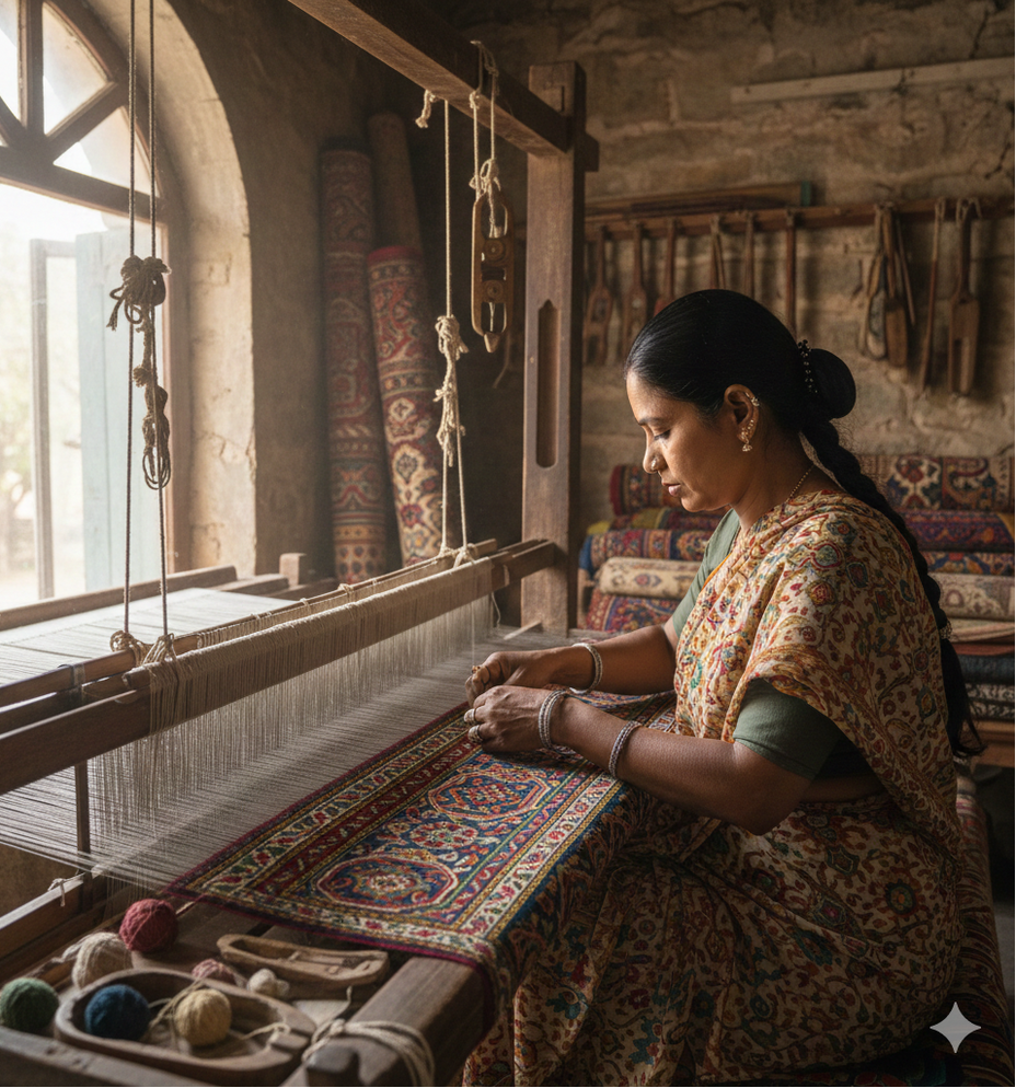 Hand-knotted rugs are among the oldest and most intricate weaving traditions, originating over 2,500 years ago in Central Asia and Persia. At The House of Looms, skilled Bhadohi artisans tie each knot by hand on vertical looms, a months-long process that delivers exceptional durability, intricate detail, and timeless textile art.